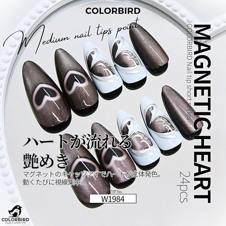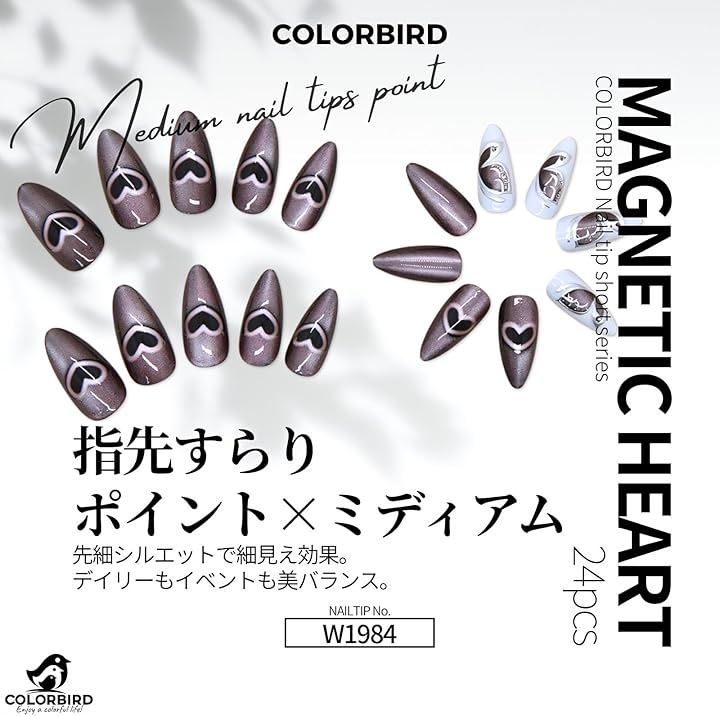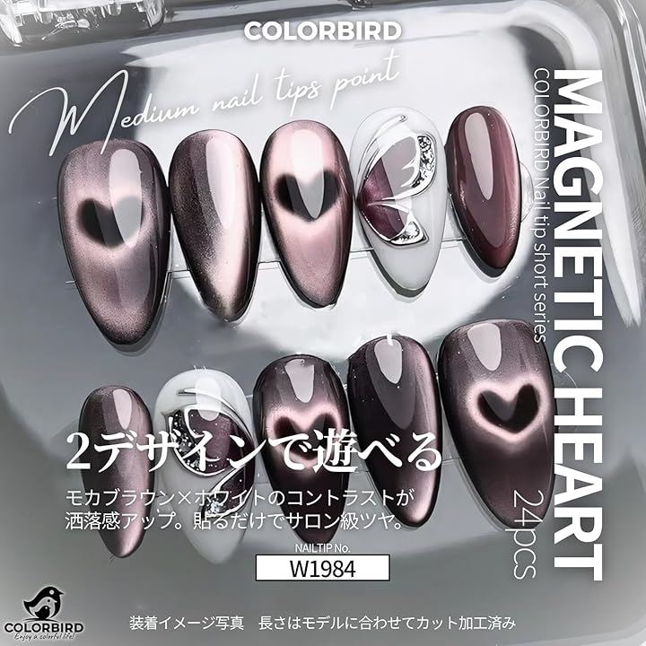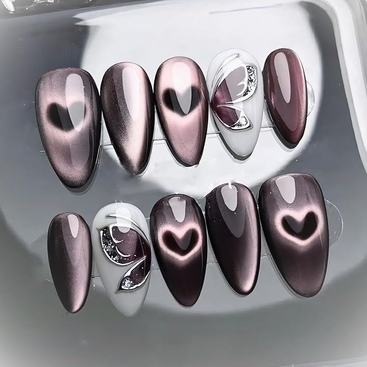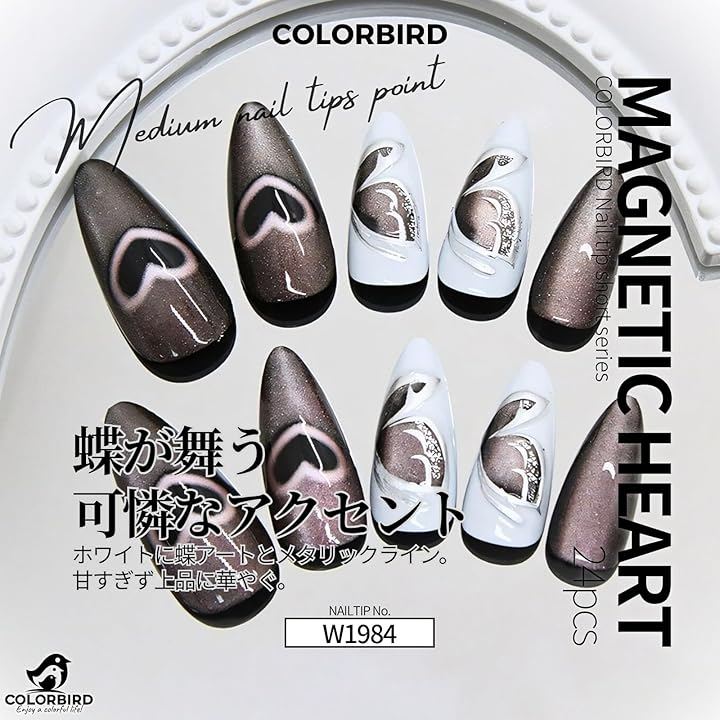 光の角度で輝きが変化するマグネットネイルに、ハート柄と蝶モチーフを融合させたミディアムポイント型ネイルチップ。