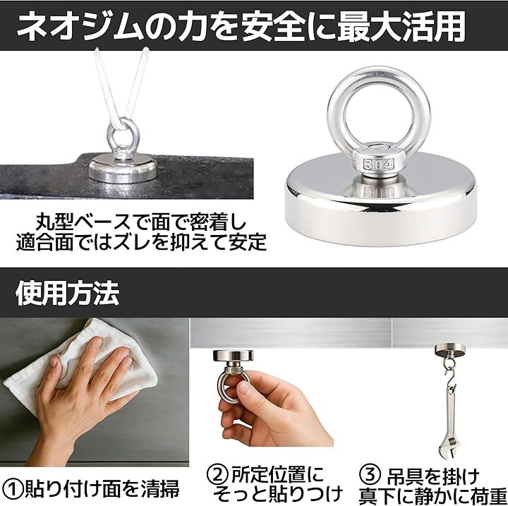「装着3ステップ」 (1)貼り付け面を清掃>乾燥 (2)所定位置にそっと密着 (3)吊具を掛け真下に静かに荷重。