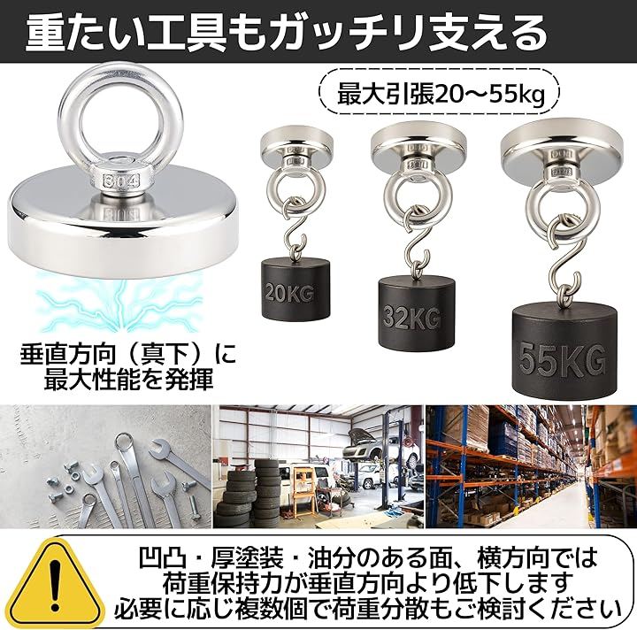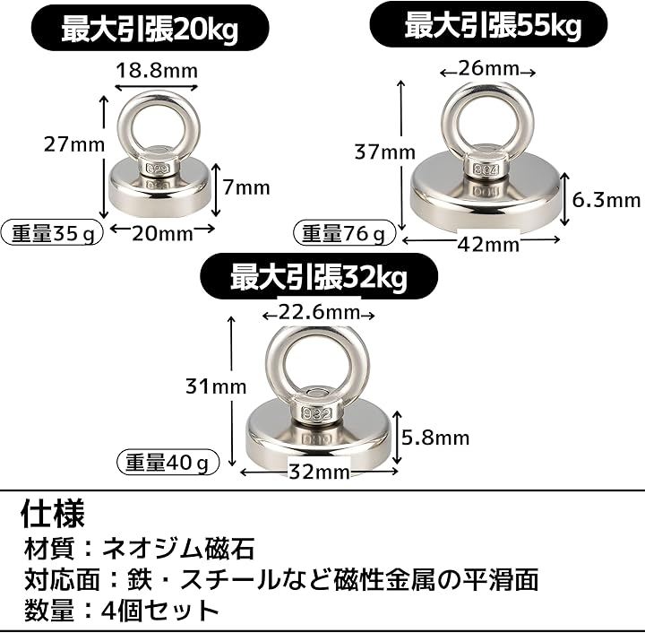 「仕様」 材質:ネオジム磁石 最大引張:55kg(試験条件により変動) 寸法:H37xD42mm 対応面:鉄・スチールなど磁性金属の平滑面 不適合:アルミ/銅/一部ステンレス、凹凸・厚塗装・油分/水分が残る面 数量:4個