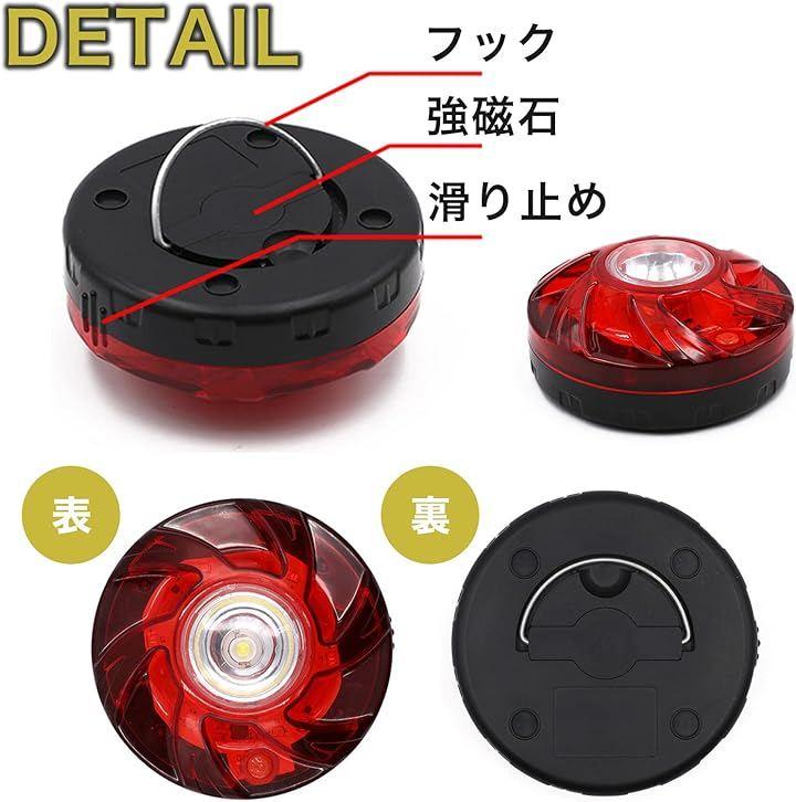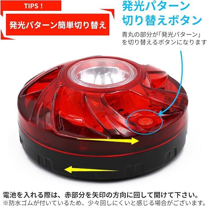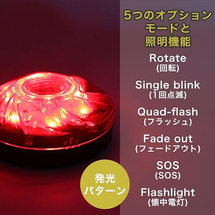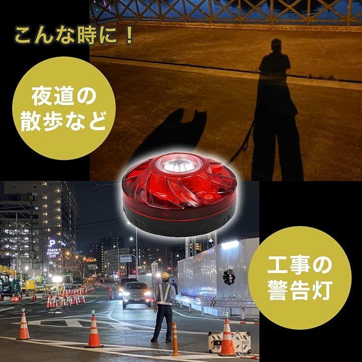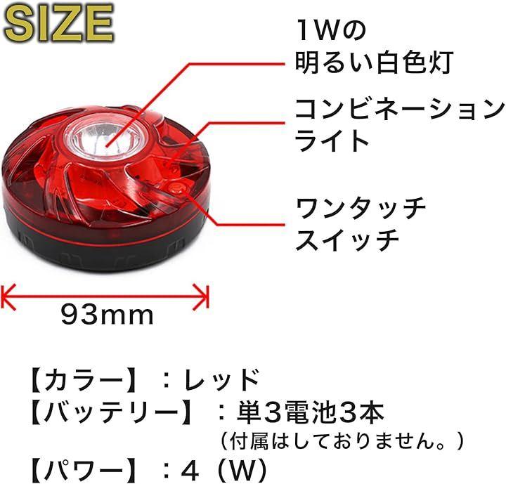「詳細仕様」 ・発光モード:5種類+照明機能(Rotate/Single Blink/Quad-Flash/Fade Out/SOS/Flashlight) ・サイズ:直径 約93mm x 高さ 約4cm ・カラー:レッド(赤色LED) ・電源:単三電池x3本(別売)/充電池対応 ・出力:約4W ・素材:ABS樹脂(防水シェル構造)+マグネット付き底面 ・防水等級:IP65相当 ・取付方法:マグネット固定/フック吊り下げ/置き型対応 ・用途:非常灯/工事灯/防災ライト/懐中電灯/安全灯/作業灯