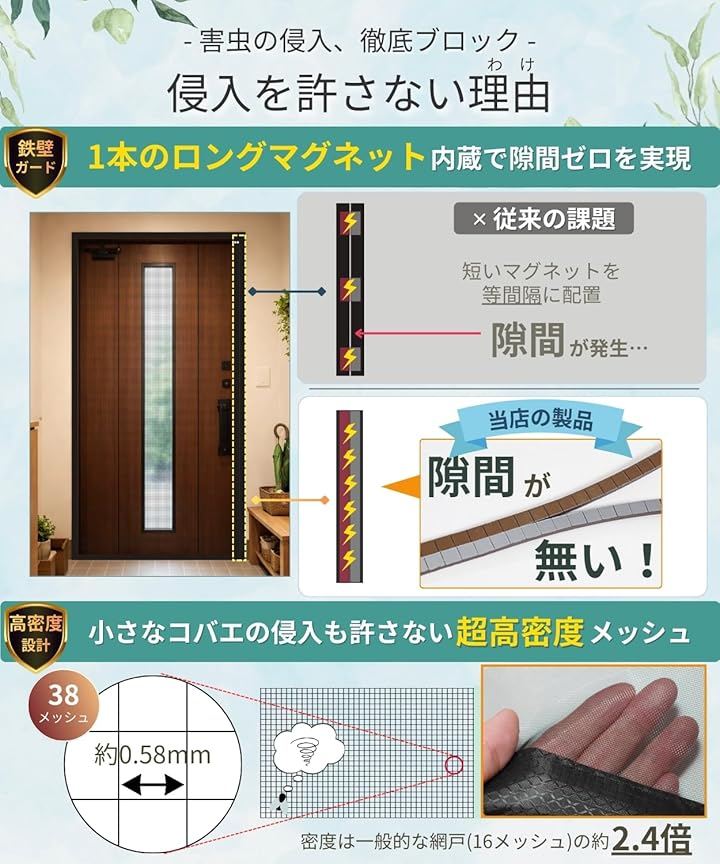 超細かい38メッシュ:網目約0.4mmの高密度メッシュで、蚊・ハエなどの小さな虫もしっかりブロックしながら風通しを確保します。