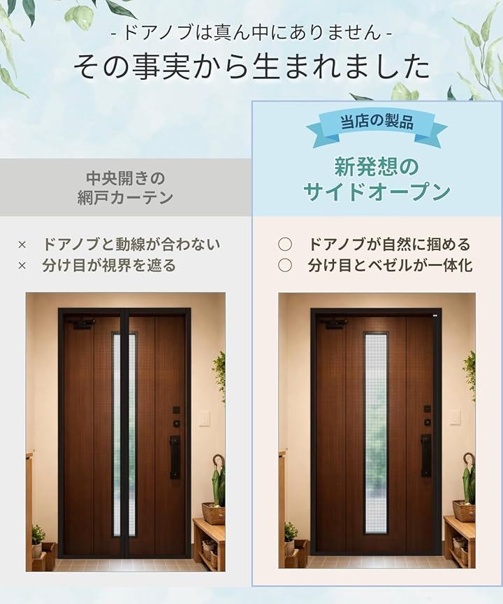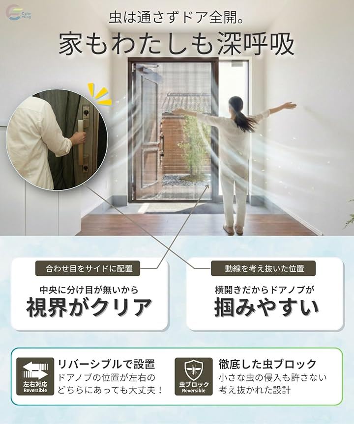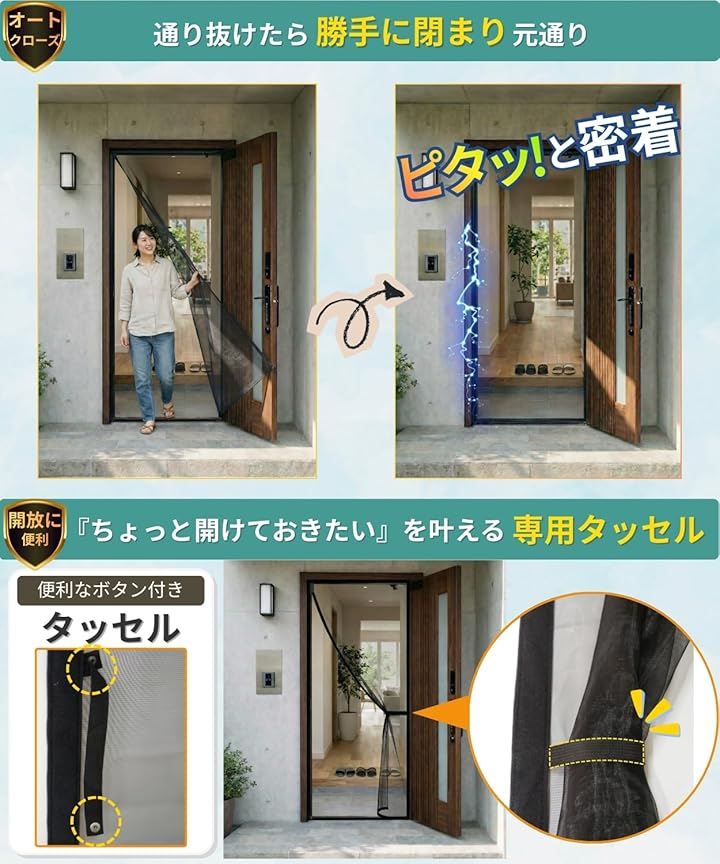 ドアの開閉に合わせてスムーズに開き、通過後はマグネットで自然に閉じるため、隙間ができにくく虫の侵入を防ぎます。