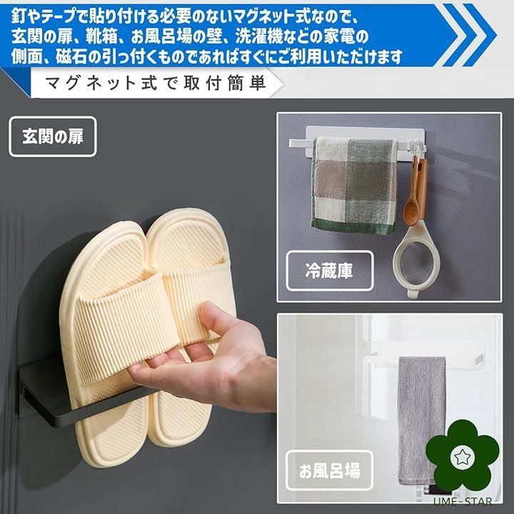 釘やテープで貼り付ける必要のないマグネット式なので、玄関の扉、靴箱、お風呂場の壁、洗濯機などの家電の側面、磁石の引っ付くものであればすぐにご利用いただけます。