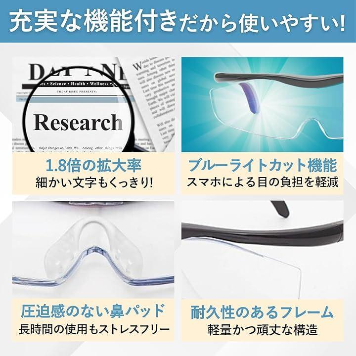 「セット内容」 拡大鏡 2個セット(1.8倍) ブルーライトカットレンズ搭載 メガネの上からでも装着可能 軽量設計で長時間使用も快適