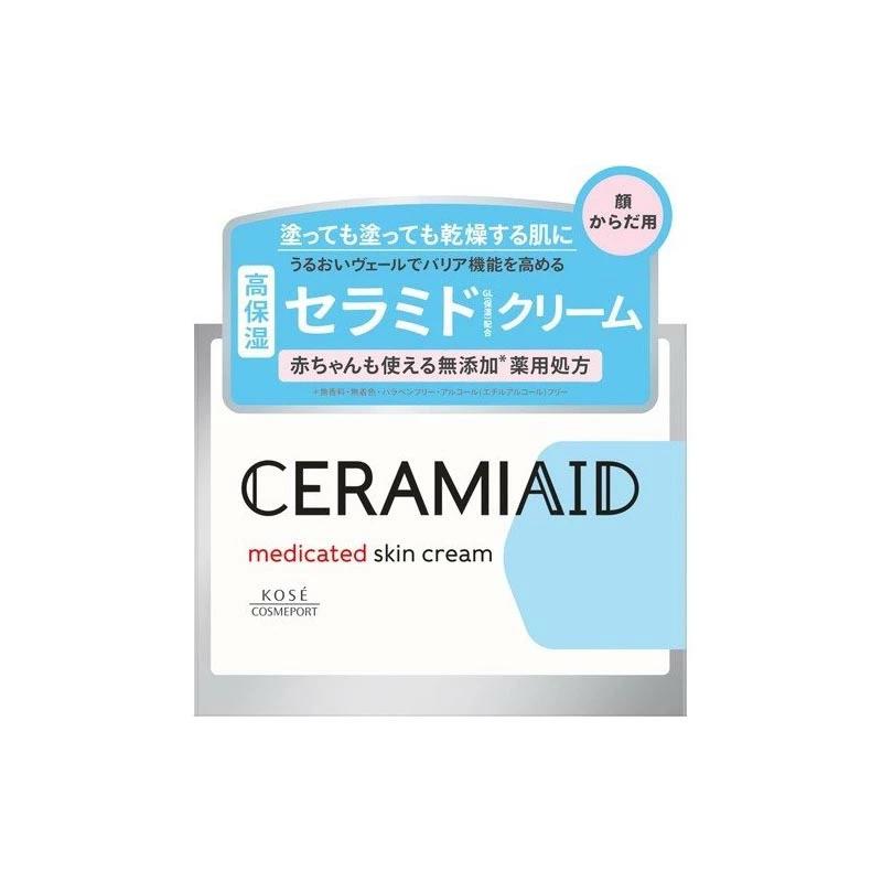【セラミエイド 薬用スキンクリームの商品詳細】●赤ちゃんも使える無添加*薬用処方のスキンクリーム。●濃厚なクリームが密着浸透(角質層まで)。●うるおいヴェールでバリア機能を高め、乾かない肌へみちびきます。●たっぷり使えるサイズ。*無香料・無着色・パラベンフリー・アルコール(エチルアルコール)フリー●【販売名】CE 薬用スキンクリーム【効能 効果】抗炎症効果肌あれ・ひび・あかぎれを防ぐ【使用方法】適量をとり、手のひらでよくあたためてから、マッサージするようになじませてください。【成分】グリチルレチン酸ステアリル※、精製水、流動パラフィン、ワセリン、ジプロピレングリコール、1、3-ブチレングリコール、スクワラン、濃グリセリン、自己乳化型モノステアリン酸グリセリル、セトステアリルアルコール、ベヘニルアルコール、モノステアリン酸ポリエチレングリコール、L-セリン、N-ステアロイルフィトスフィンゴシン、dl-α-トコフェロール、ユビデカレノン、2-エチルヘキサン酸セチル、アクリル酸、メタクリル酸アルキル共重合体、イソステアリン酸、エデト酸二ナトリウム、ヒドロキシエチルセルロース、メチルポリシロキサン、水酸化ナトリウム、フェノキシエタノール※:有効成分、無印:その他の成分【注意事項】・ご使用後は、キャップをきちんとしめてください。・高温の場所や、日のあたる場所には置かないでください。【原産国】日本