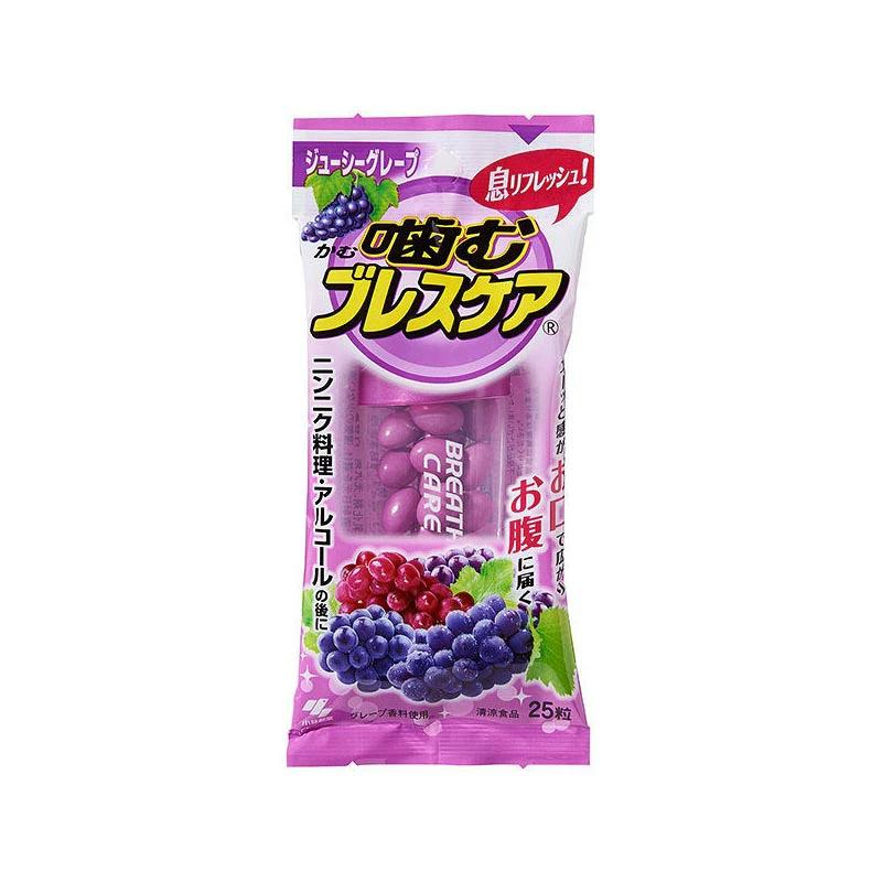 【噛むブレスケア ジューシーグレープの商品詳細】●噛むブレスケアは、息リフレッシュグミです●噛んだ瞬間、グミの中の清涼成分(メントール、パセリオイル)とフレーバーがお口に広がります●清涼成分はお腹まで届き、スーッと感が広がります【召し上がり方】1回の目安量:1-2粒、気になるときは2-3粒。【品名・名称】清涼食品(グミ)【噛むブレスケア ジューシーグレープの原材料】砂糖、マルトース、ゼラチン、水飴、還元水飴、でん粉、植物油脂、パセリ油/ソルビトール、ビタミンC、乳酸カルシウム、香料、酸味料、増粘多糖類、着色料(アカビート、クチナシ、スピルリナ青)、乳化剤、光沢剤【栄養成分】(25粒当たり):エネルギー:70kcaL、たんぱく質:1.4g、脂質:0g、炭水化物:16g、食塩相当量:0-0.087g【保存方法】直射日光を避け、湿気の少ない涼しいところに保管してください。【注意事項】・開封後はフタを閉め、湿気を避けて保存してください。・本品は血中のアルコール濃度には影響を与えません。・粒が割れている場合がありますが、製品の品質に異常はありません。・開封後はなるべく早くお召し上がりください。【原産国】日本【発売元、製造元、輸入元又は販売元】小林製薬