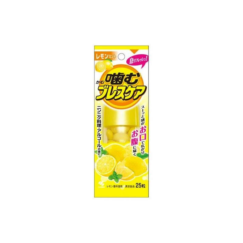 【小林製薬 噛むブレスケア レモンミントの商品詳細】●噛むブレスケアは、息リフレッシュグミです●噛んだ瞬間、グミの中の清涼成分(メントール、パセリオイル)とフレーバーがお口に広がります●清涼成分はお腹まで届き、スーッと感が広がります【召し上がり方】1回の目安量:1-2粒、気になるときは2-3粒。【品名・名称】清涼食品(グミ)【小林製薬 噛むブレスケア レモンミントの原材料】砂糖、マルトース、ゼラチン、水飴、でん粉、植物油脂、パセリ油/ソルビトール、ビタミンC、乳酸カルシウム、香料、酸味料、増粘多糖類、乳化剤、光沢剤、着色料(マリーゴールド)【栄養成分】(25粒当たり):エネルギー:70kcaL、たんぱく質:1.4g、脂質:0g、炭水化物:16g、食塩相当量:0-0.073g【保存方法】直射日光を避け、湿気の少ない涼しいところに保管してください。【注意事項】・開封後はフタを閉め、湿気を避けて保存してください。・本品は血中のアルコール濃度には影響を与えません。・粒が割れている場合がありますが、製品の品質に異常はありません。・開封後はなるべく早くお召し上がりください。【原産国】日本【発売元、製造元、輸入元又は販売元】小林製薬