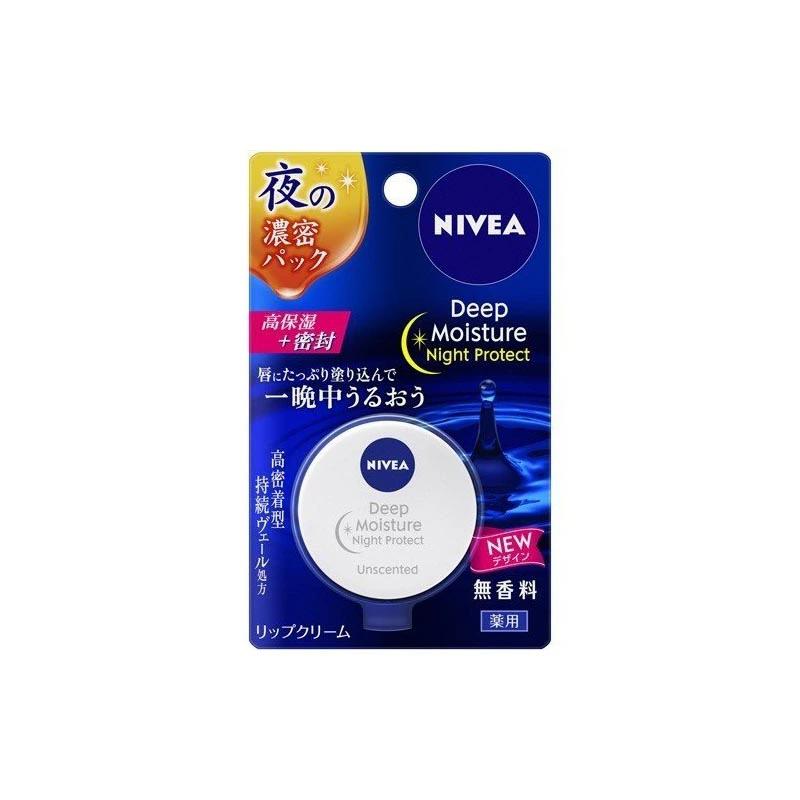 【ニベア ディープモイスチャー ナイトプロテクト 無香料の商品詳細】●唇にたっぷり塗り込んで、一晩中うるおう。●夜の濃密パック、リップクリーム。●【販売名】ニベア薬用リップバームAm【使用方法】指またはリップブラシに適量をとって唇にのばしてください。【成分】酢酸DL-α-トコフェロール*、グリチルレチン酸ステアリル*、ワセリン、リンゴ酸ジイソステアリル、パルミチン酸デキストリン、流動パラフィン、マイクロクリスタリンワックス、ホホバ油、水添ポリブテン、ジイソステアリン酸ポリグリセリル、ミツロウ、グリセリン、スクワラン、トレハロース、ハチミツ、ローヤルゼリーエキス、シア脂、パラフィン、ジメチコン、フェノキシエタノール、BHT、水、エタノール*は「有効成分」無表示は「その他の成分」【注意事項】・高温の所には置かないでください。・傷、湿疹等の異常のある時は使わないでください。・赤み、かゆみ、刺激等の異常が出たら使用を中止し、皮フ科医へ相談してください。使い続けると症状が悪化することがあります。・子供や認知症の方などの誤食等を防ぐため、置き場所にご注意ください。【原産国】日本