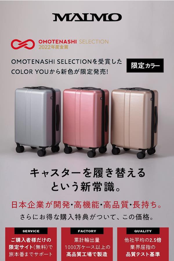 【商品詳細】●商品名:COLOR YOU (Mサイズ) ●サイズ:高さ66cm幅46.5cm×奥行26cm ●重量:約3.6kg ●容量:約61L ●素材:ケース/ポリカーボネート100% 内装/ポリエステル ●取扱説明書 ●1年間保証書 ●保管用不織布袋 ●キャスター交換用六角レンチ ●製造国:日本企業開発・中国専用工場製 【軽くて、強い。収納力もバッチリ】軽さと強さを兼ね備えた、ドイツ企業開発のポリカーボネート100%の素材。400kg以上の圧力にも耐えうる(※Sサイズにて試験済)優れたケース素材が大切な荷物を守ります。61Lの大容量なのに、本体の重さは約3.6kgと超軽量。女性やお子様でも持ち上げられる軽さです。書類やノートパソコンが入るメッシュポケットとクロスベルト付きで、整理整頓がしやすいレイアウト。 【取り外し可能な静音キャスター】HINOMOTO製の超静音キャスター。従来のキャスターに比べて走行時の騒音を20デシベルカットした最新タイヤ素材。55mm直径の大きめダブルホイールで、走行ラクラク。付属の六角レンチで簡単にキャスター交換ができるため、キャスターの故障でスーツケースを買い替える必要がありません。加水分解しない素材なのでキャスターの丸洗いも可能。 ※別売りのスペアキャスターも発売中。※交換用のキャスターは付属しておりません。 【USBポート付きTSAロック・3段階調節キャリーバー】最新セキュリティーのTSA008モデルを採用。暗証番号タイプなので、鍵の紛失のリスクがありません。USBポート搭載で、モバイルバッテリーを入れたまま充電可能。3段階調節キャリーバーは使用シーンや身長に合わせて使い分けいただけます。 【入れ子保管可能で省スペース!買う前も後も安心】COLOR YOUはS/M/Lどのサイズの組み合わせでも重ねて収納できるため、少ないスペースで複数のスーツケースを保管いただけます。※LサイズにMサイズを収納する場合、Mサイズのキャスターを取り外す必要があります。 お客様の安心安全のため、他社の2.5倍以上の約20項目にわたる試験を実施。徹底的な品質確認をおこなっています。内装に印刷されたQRコードからいつでもアクセス可能な、ご購入者様限定のトラベルサポートサイトをご用意しています。商品本体、交通機関、宿泊施設等についての旅に役立つ情報が満載。
