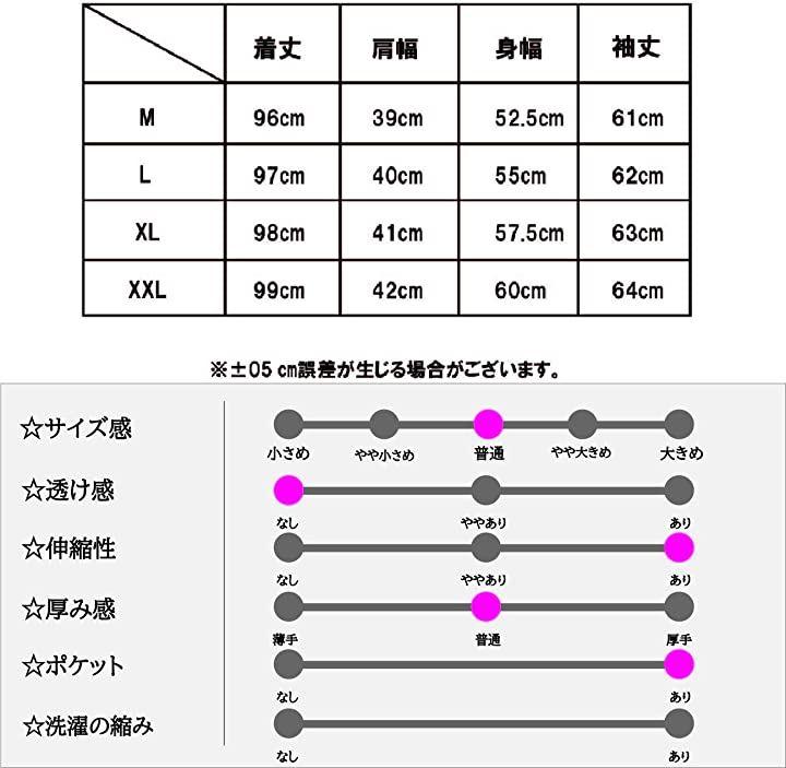 ・(M) 着丈 96cm 肩幅 39cm 身幅 52.5cm 袖丈 61cm (L) 着丈 97cm 肩幅 40cm 身幅 55cm 袖丈 62cm (XL) 着丈 98cm 肩幅 41cm 身幅 57.5cm 袖丈 63cm (XXL) 着丈 99cm 肩幅 42cm 身幅 60cm 袖丈 64cm