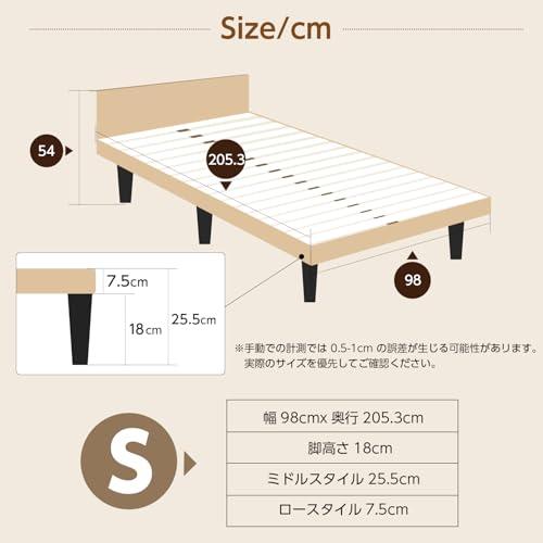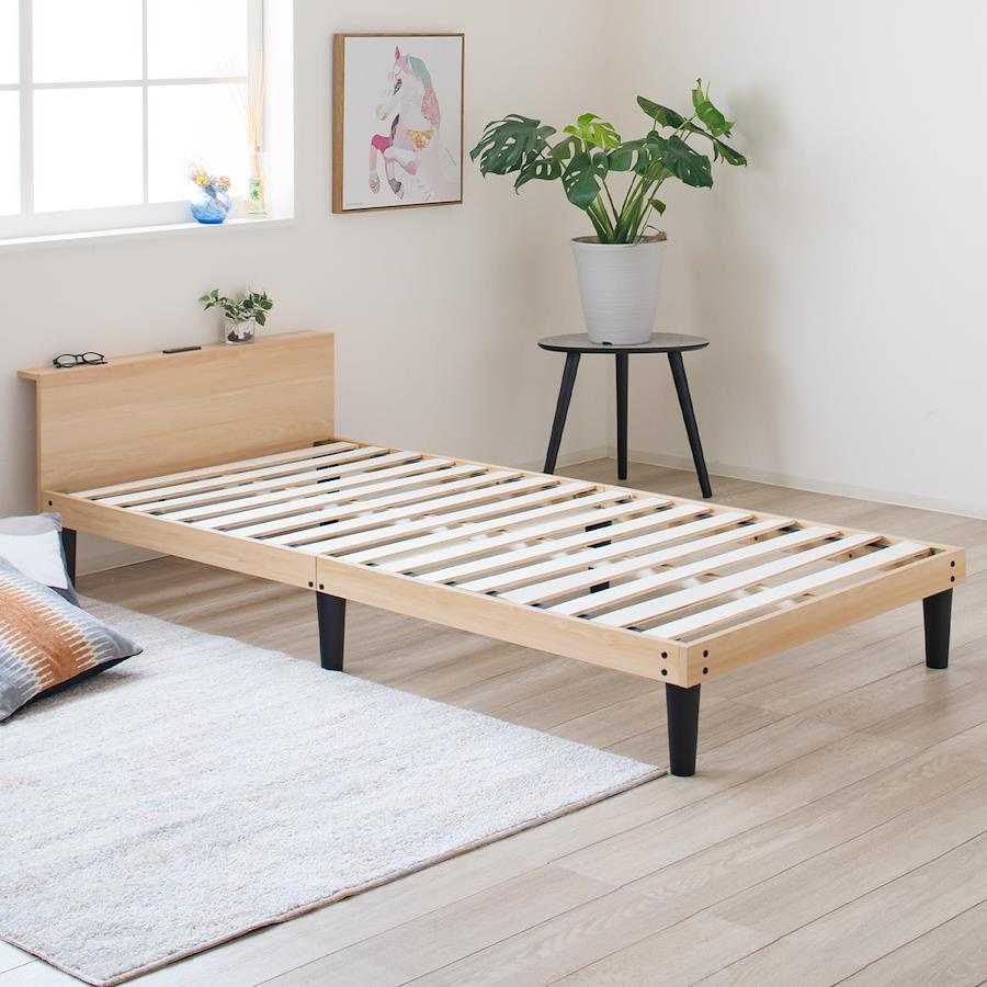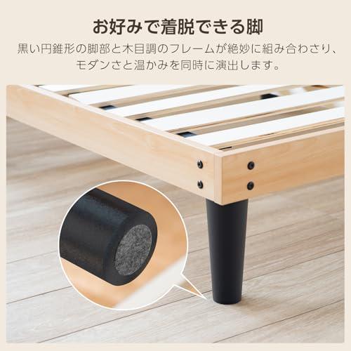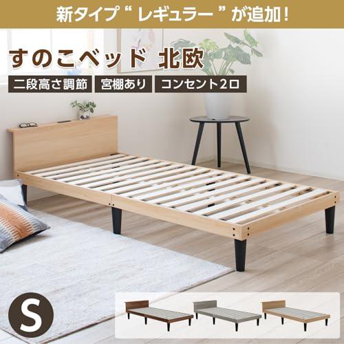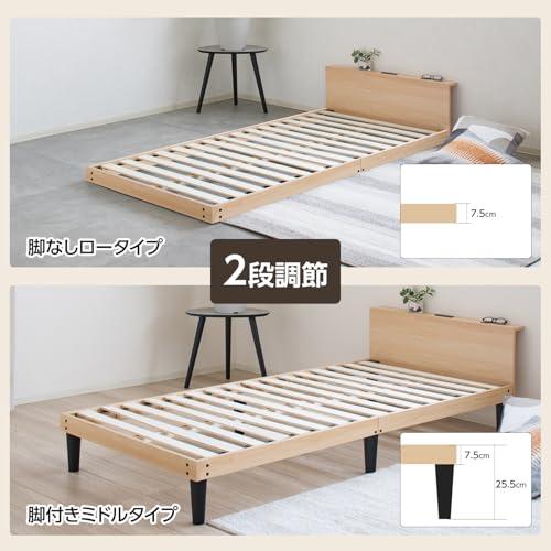 【9センチのサイドフレーム、頑丈な構造】9センチのサイドフレームで耐荷重UP。メラミン樹脂化粧パーティクルボードの堅牢な構造で、安定性と耐久性があります。耐久性に優れたLVL積層合板のすのこを使用しています。安定した寝心地を提供します。 【ヘッドボード完成】枕元に小物を置けるヘッドボード組み立て済です。便利な宮棚が付いており、スマートフォンや小物などを置けます。 【コンセント2口付き】寝ている間にスマホ、タブレットなど充電が便利なコンセントが2つ装備されています。2台をぴったり並べてキングサイズになります。また、3人で使用することも可能です。 【通気性抜群】すのこの構造により、良好な通気性を実現し、寝汗や梅雨のじめじめ、冬の結露などの湿気を効率よく逃がし、快適な寝具環境を提供します。 【高さ2段階調整機能】ベッドの高さをお好みに合わせて調節できます。おしゃれでナチュラルなロースタイルのデザインが、お部屋に温かみと個性を与えます。