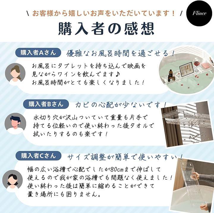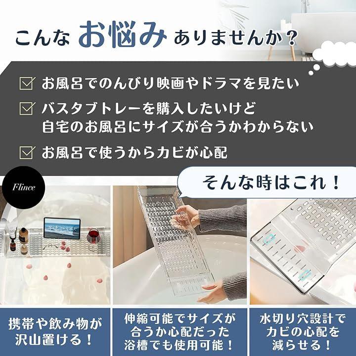 56.5cmから80cmまで伸縮可能なこのトレーは、どんなサイズのバスタブにもぴったりフィットし、便利な機能が満載です。
