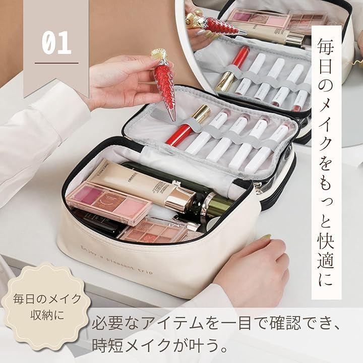 大容量設計で、ファンデーションやリップ、ブラシ、スキンケアアイテムなどをすっきり整理できる。