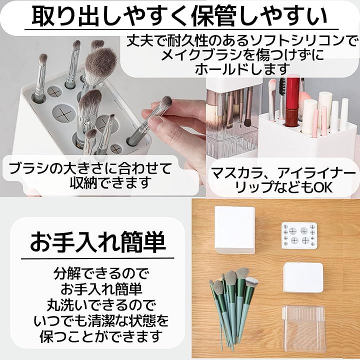 「取り出しやすく、保管しやすい」 丈夫で耐久性のあるソフトシリコンで、メイクブラシを傷つけずにホールドします。