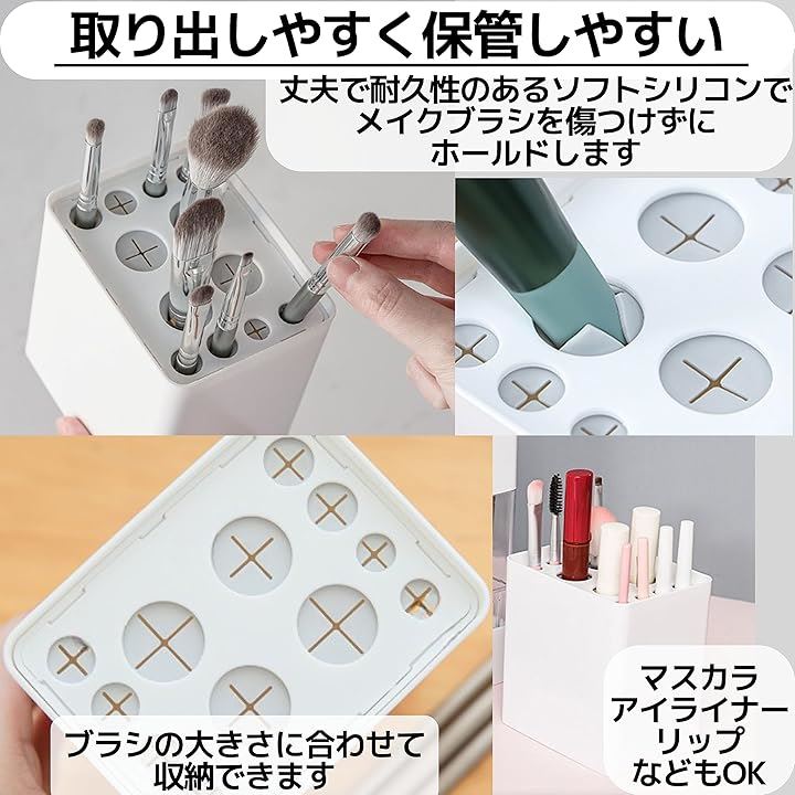 「取り出しやすく、保管しやすい」 丈夫で耐久性のあるソフトシリコンで、メイクブラシを傷つけずにホールドします。