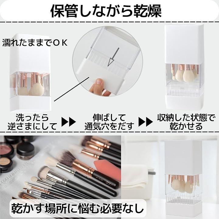 洗ったブラシを乾燥させるときは、ケースの先を伸ばして逆さまにすることで、保管しながらメイクブラシを乾燥させることができます。
