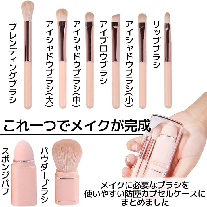 「これ一つでメイクが完成」:アイシャドーブラシ3本(大、中、小型)、リップブラシ、眉ブラシ、ブレンディングブラシ、パウダーブラシ、スポンジパフの計8本のブラシが含まれています。