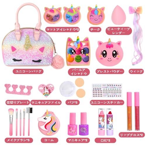 【26 IN 1 メイクセット 女の子】26点のメイクアップセットには、口紅、リップグロス、アイシャドウ、子供用マニキュア、メイク道具、ミラーコーム、フィンガーセパレーター、爪やすり、ネイルステッカー、パウダー、カラフルなウィッグ付きヘアクリップ、頬紅、クロスボディスタイルの化粧品バッグが含まれます。女の子のための完璧なメイクアップ ルーチンを作成しましょう。 【ポータブルメイクアップキット】この子供用メイクアップセットはユニコーンの要素でデザインされており、ユニコーン子供用メイクアップセットが好きな小さな女の子に最適です。クロスボディメイクアップバッグは、外出先のメイクアップパーティーやプリンセスロールプレイゲームに必要なすべてのメイクアップアクセサリーを簡単に収納できます。 【安全な素材の子供 メイクセット】このキッズ・女の子メイクセットは高品質の材料で作られており、国際的な子供のおもちゃ基準の安全要件を満たしています。 メイクアップは石鹸と水で簡単に落とせ、肌にシミを残しません。 ご使用前に、お子様の皮膚テストを行うことをお勧めします。 【お化粧セット 女の子】お化粧遊びは、子どもたちの運動能力を高め、創造力と想像力を育みながら、小さな女の子と一緒に美を探求するのに役立ちます。 小さな女の子に、お姫様のようにお化粧をしているふりをしてあげましょう。 【女の子 プレゼント】女の子のメイクの夢を叶えます!化粧品バッグは女の子の美的能力を向上させ、美しい外観と豊富な内??部パーツがあなたの小さなプリンセスに色合わせと創造性を考えるよう促し、実践能力を向上させます。 小学 1 2 3 4 5 6 年生女子プレゼント、ハロウィーン、誕生日、その他の休日のギフトに最適です。