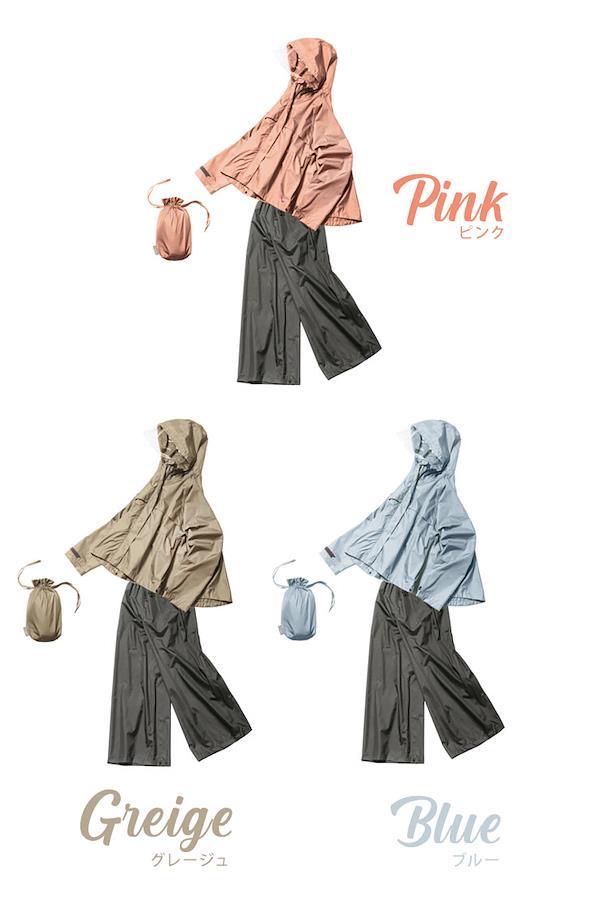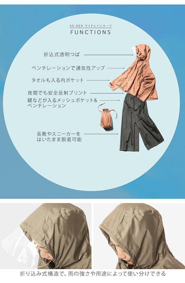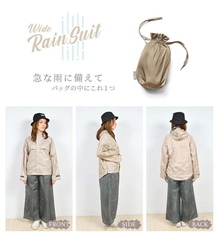 【ワイドレインスーツ】洋服の上から重ね着できる上下セットのレインウェア。下にきる洋服を選ばず雨の日もおしゃれを楽しめます。ゆったりシルエットのワイドデザインなので、身体のラインをひろわず、体型カバーもでき着痩せ効果抜群です!