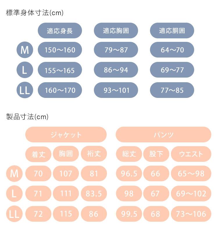 ■サイズ【ジャケット】M:着丈 70cm / 胸囲 107cm / 裄丈 81cmL:着丈 71cm / 胸囲 111cm / 裄丈 83.5cmLL;着丈 72cm / 胸囲 115cm / 裄丈 86cm【パンツ】M:総丈 96.5cm / 股下 66cm / ウエスト 65~98cmL:総丈 98cm / 股下 67cm / ウエスト 69~102cmLL:総丈 99.5cm / 股下 68cm / ウエスト 73~106cm