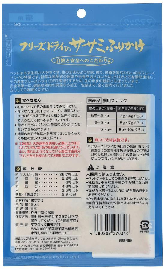 本体サイズ (幅X奥行X高さ):15×3×24cm本体重量:0.025kg原産国:日本ブランド:ママクック原材料:グレインフリーほぐすのが大変という方に、ササミをほぐした商品です。 食べ飽きたドライフードや缶詰にふりかけると完食します。 犬用ドライフードにかけても構いません。
