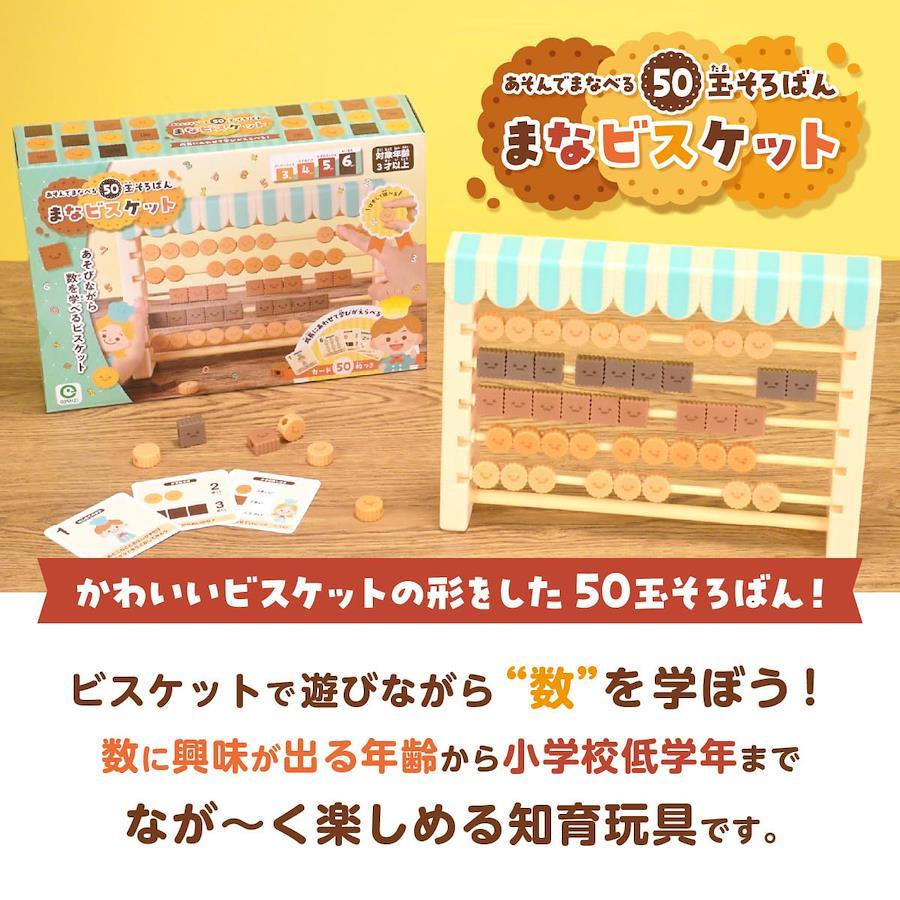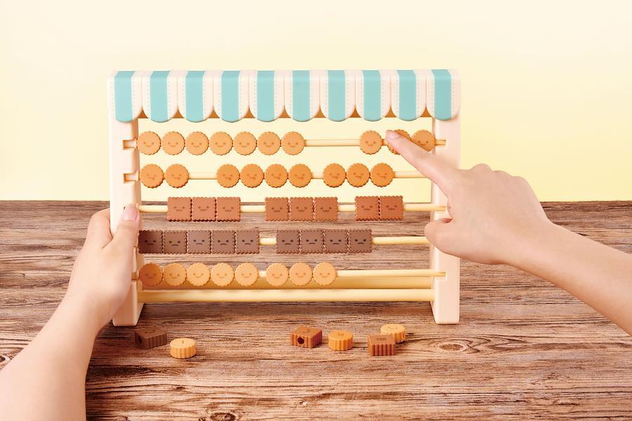 かわいいビスケットの形をした玉そろばん。 ピースは取り外しが可能で、付属の「計算できるかなシート」を使えば簡単な足し算・引き算を学ぶことができます。