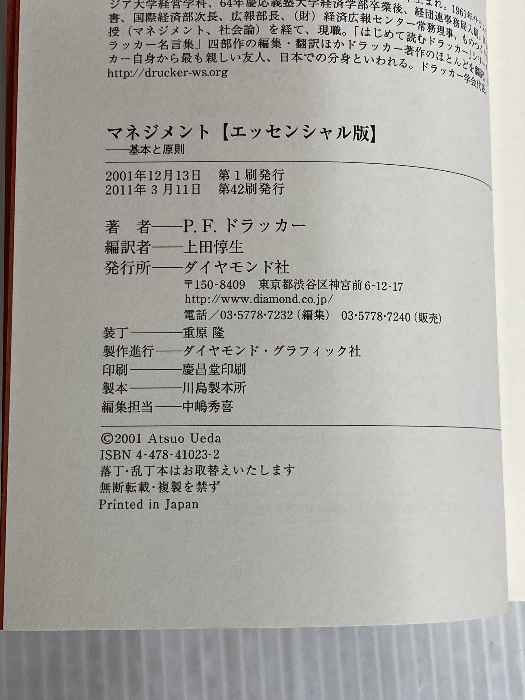 ■商品詳細■ 商品名・マネジメント[エッセンシャル版] - 基本と原則 ダイヤモンド社 ピーター・F・ドラッカー/ ■商品状態■2011年3月11日 第42刷発行。裸本(カバー無し)。表紙に多少のスレ、ヤケ、ヨレ、シミ、天地小口に多少のスレ、ヤケ、傷み、本に多少のスレ、ヤケ、折れ目、天地小口に多少のスレ、ヤケ、キズ、があります。本を読むことに支障はございません。※注意事項※■毎商品チェック後出品しておりますが、中古品ということもあり、多少の書き込み等のチェック漏れがあった際はご容赦下さい。■付録等の付属品がある商品の場合、記載されていない物は『付属なし』とご理解下さい。■併売販売をしているため、在庫切れの場合はキャンセルとなります。予めご了承ください。