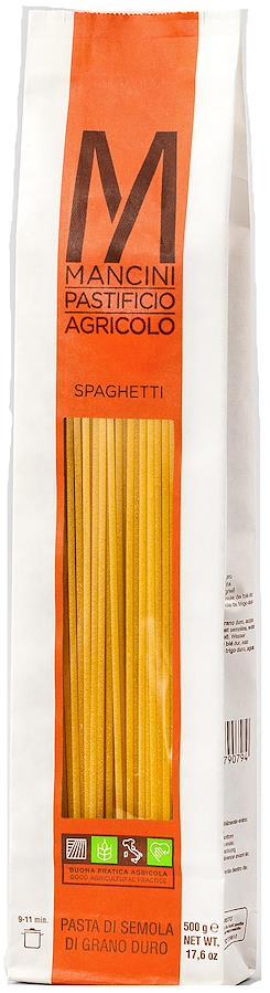 マンチーニ社のパスタはマルケ州産の自社小麦100%。パスタ専用に栽培する原料小麦(レヴァンテ種を中心とする)を数種ブレンドし、低温長時間乾燥によって小麦の風味をパスタに封じ込めています。「スパゲッティ」は、「1本の糸、弦」というのが名前の由来で、世界でもっとも人気の形。一般的にトマトやバジルのソースとよく合います。