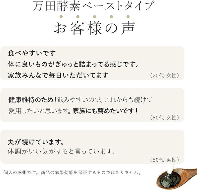 この商品について 【万田酵素MULBERRYについて】万田酵素は、 果実類、根菜類、穀類、海藻類、豆やゴマ類など53種類以上の植物性原材料を、独自の技術で3年3ヵ月以上発酵・熟成させた植物発酵食品です。「万田酵素MULBERRYチューブタイプ」は、持ち運びしやすく、お好みで量を調節できるチューブタイプ。外出先でも、自宅でも気軽にお召し上がりいただけます。 【内容量】78g (26g×3本) 【賞味期限】枠外下部に記載 製造日より2年 【お召し上がり方】健康補助食品として、体調に合わせてお好みの量をティースプーン等にとってお召し上がりください。本品を直接口につけてのご使用はお止めください。 【原材料名】糖類(黒糖、果糖、ブドウ糖)、大粒果実(リンゴ、カキ、バナナ、パインアップル)、穀類(白米、玄米、もち米、アワ、大麦、キビ、トウモロコシ)、かんきつ類(ミカン、ハッサク、ネーブルオレンジ、イヨカン、レモン、夏ミカン、カボス、キンカン、ザボン、ポンカン、ユズ)、小粒果実(桑の実、ブドウ、アケビ、イチジク、マタタビ、山ブドウ、山桃、イチゴ、ウメ)、豆・ゴマ類(大豆、黒ゴマ、白ゴマ、黒豆)、根菜類(ニンジン、ニンニク、ゴボウ、ユリ根、レンコン)、海藻類(ヒジキ、ワカメ、ノリ、青ノリ、コンブ)、ハチミツ、クルミ、澱粉、キュウリ、セロリ、シソ