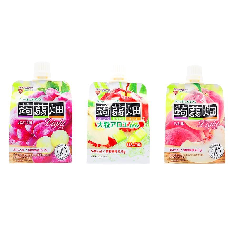 クラッシュタイプの蒟蒻畑の4種アソートです。ぶどう味、りんご味、もも味。ぶどう・りんご2箱、もも1箱の計5箱。