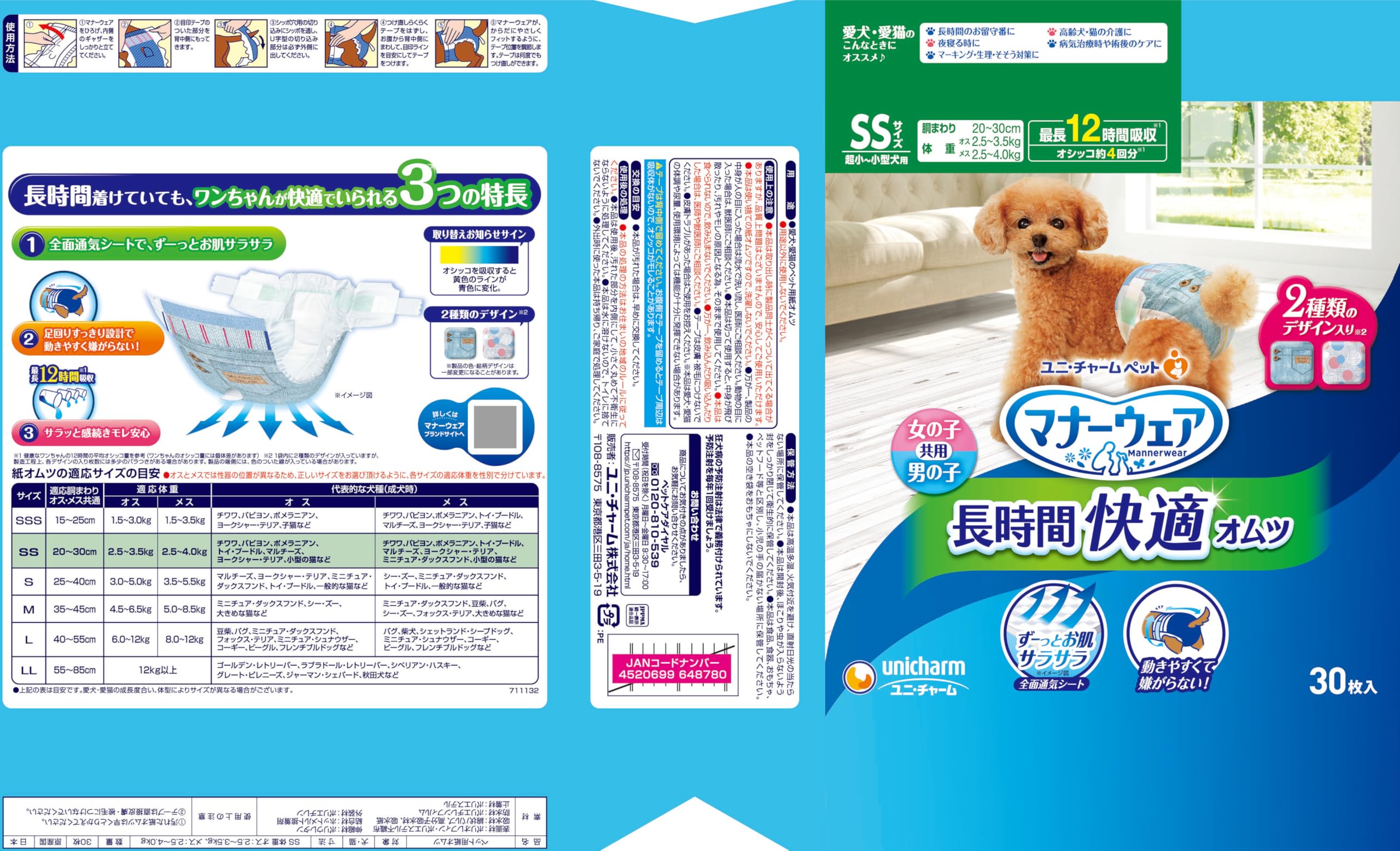 ユニ・チャームペット「マナーウェア紙オムツ」は、動いてもズレずにモレ安心な紙オムツ(男女共用)です。