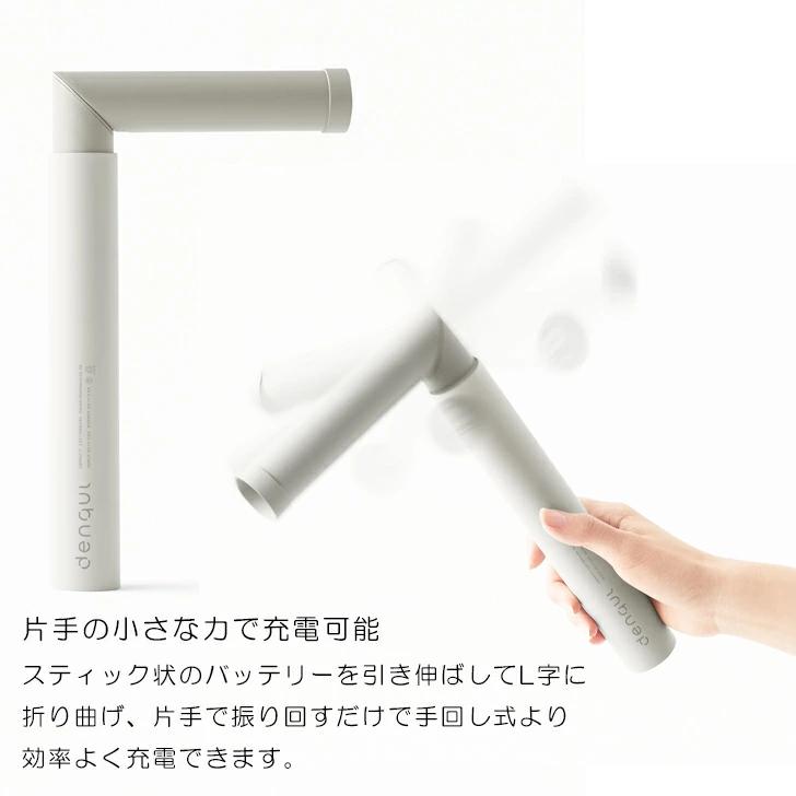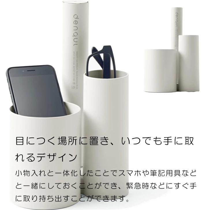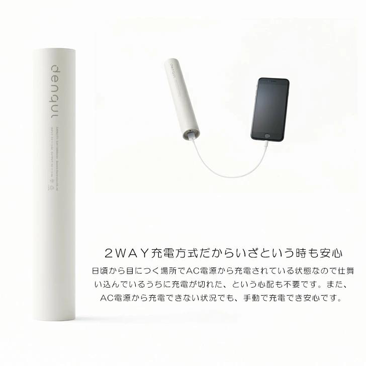 手動発電式バッテリーdenqul(デンクル)は、充電された状態で自宅に常備しておき、非常時にそれを持って避難することを想定したバッテリーです。小物入れと一体化したクレードル(充電台)にすることで、スマートフォン、めがねや筆記用具といったものと一緒に保管しておけるデザインです。2WAY充電方式だからいざという時も安心日頃から目につく場所でAC電源から充電されている状態なので仕舞い込んでいるうちに充電が切れた、という心配も不要です。また、AC電源から充電できない状況でも、手動で充電でき安心です。片手の小さな力で充電可能スティック状のバッテリーを引き伸ばしてL字に折り曲げ、片手で振り回すだけで手回し式より効率よく充電できます。目につく場所に置き、いつでも手に取れるデザイン小物入れと一体化したことでスマホや筆記用具などと一緒にしておくことができ、緊急時などにすぐ手に取り持ち出すことができます。