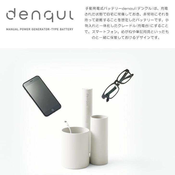 手動発電式バッテリーdenqul(デンクル)は、充電された状態で自宅に常備しておき、非常時にそれを持って避難することを想定したバッテリーです。小物入れと一体化したクレードル(充電台)にすることで、スマートフォン、めがねや筆記用具といったものと一緒に保管しておけるデザインです。2WAY充電方式だからいざという時も安心日頃から目につく場所でAC電源から充電されている状態なので仕舞い込んでいるうちに充電が切れた、という心配も不要です。また、AC電源から充電できない状況でも、手動で充電でき安心です。片手の小さな力で充電可能スティック状のバッテリーを引き伸ばしてL字に折り曲げ、片手で振り回すだけで手回し式より効率よく充電できます。目につく場所に置き、いつでも手に取れるデザイン小物入れと一体化したことでスマホや筆記用具などと一緒にしておくことができ、緊急時などにすぐ手に取り持ち出すことができます。