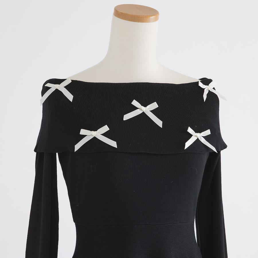 鎖骨が覗くオフショルダーに可愛いリボンがたっぷりあしらわれたフェミニンガーリーなワンピース。