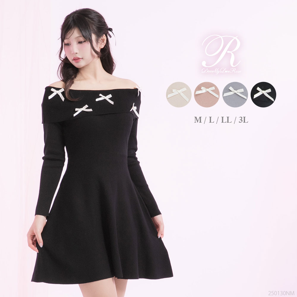 鎖骨が覗くオフショルダーに可愛いリボンがたっぷりあしらわれたフェミニンガーリーなワンピース。