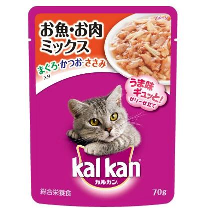 本製品1袋とドライ製品を混ぜて与えた場合の1日の給与量の目安(カルカンドライまぐろと野菜味の場合)体重2kg:ドライ25g、体重3kg:ドライ40g、体重4kg:ドライ50g、体重5kg:ドライ60g、体重6kg:ドライ70g、体重7kg:ドライ80g