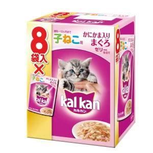 本製品1袋とドライ製品を混ぜて与えた場合の1日の給与量の目安(カルカンドライ子ねこ用の場合)生後4-8週間体重0.8kg:ドライ35g、生後-12週間体重1.2kg:ドライ45g、生後-16週間体重1.8kg:ドライ55g、生後-32週間体重3.1kg:ドライ65g、生後-52週間体重3.5kg:ドライ40g