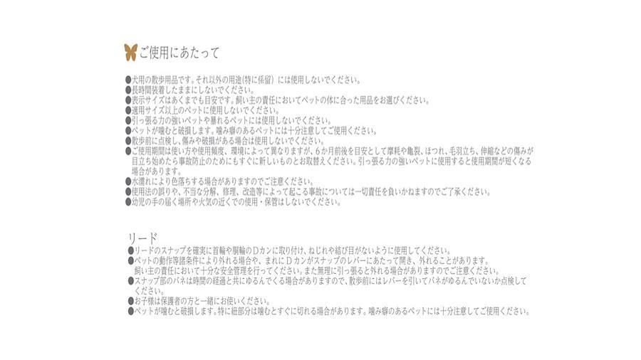 ・犬用の散歩用品です。それ以外の用途には使用しないでください。 ・表示サイズはあくまでも目安です。飼い主様の責任においてペットの体に合った用品をお選びください。 ・散歩前に点検し、傷みや破損がある場合は使用しないでください。