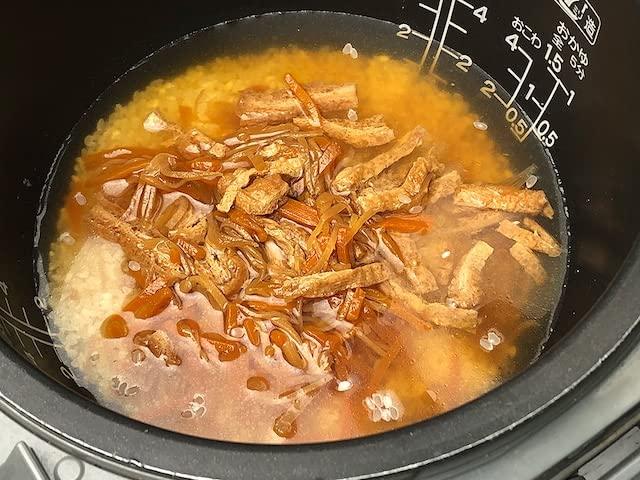 香りを逃さないように新しょうがを千切りにし、豚肉、玉ねぎ、人参で豚のしょうが焼き風に味付けしました。新しょうがと醤油の絶妙なバランスが食欲を誘います。お米と共に炊飯器に入れ、規定の水の量で炊き上げるだけの簡単調理です。おにぎりにして楽しむのもおすすめです。