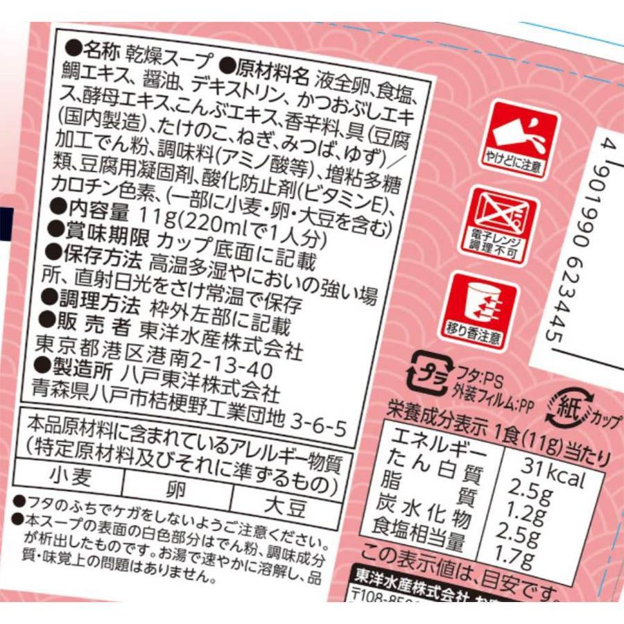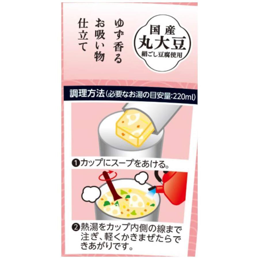 3営業日以内に発送≪新品未開封品≫:なめらか食感の豆腐入りの、カップ入りスープ。上品なゆず香る、鯛と利尻昆布の和風だしを利かせた、お吸い物仕立て。なめらか食感の国産丸大豆絹ごし豆腐、かきたま、たけのこ、みつば、ねぎ、ゆず。※商品内容の英文表記と、調理方法イラスト表記有り。なめらか食感の絹ごし豆腐入り、鯛だしに鰹と利尻昆布の旨みを利かせた、ゆず香るお吸い物仕立て。