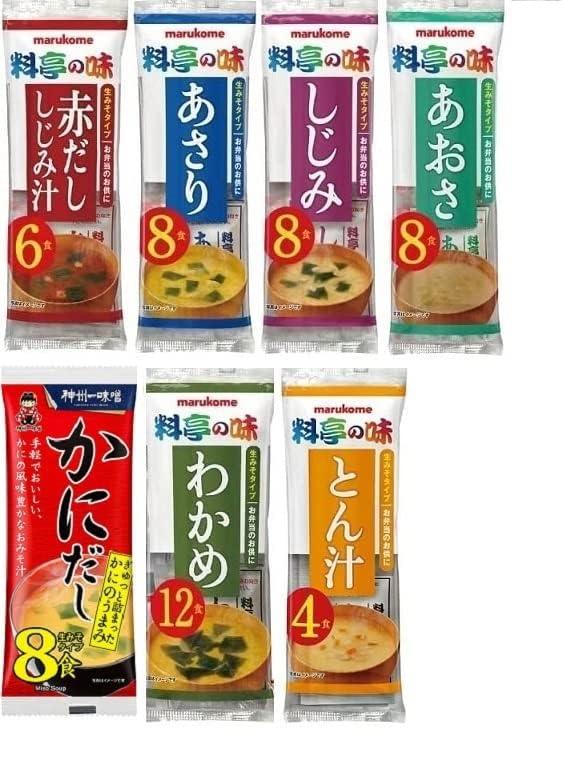 料亭の味 生みそタイプ 7種類・あさり8食・しじみ8食・わかめ12食・あおさ8食・赤だししじみ汁6食・とん汁4食・神州一味噌かにだし8食 計54食セットです。