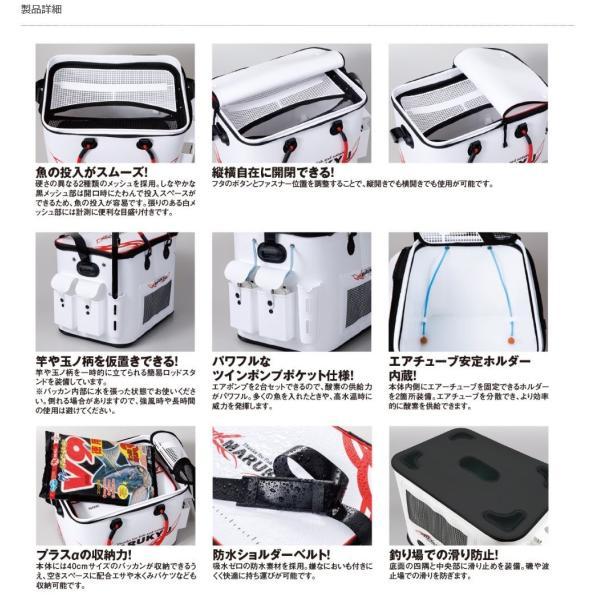 釣った魚をスピーディーに投入し、活かしたままキープ 魚の出し入れがスムーズに行なえるよう、二重構造のフタを備えた活かし用バッカン。側面にエアーポンプを2個セットできるポケット、内部にはエアーチューブを固定できる2つのホルダーがあり、キープ数が多いときや高水温時に威力を発揮します。また、竿や玉ノ柄などを一時的に立てられる簡易ロッドスタンドや、ショルダーベルトに加えてハンドグリップも装備。その他、メッシュのサイドポケット、磯や波止場での滑りを防ぐ底部の滑り止めなど、充実の機能が備わっています。サイズ :450(W)×330(D)×370(H)mm