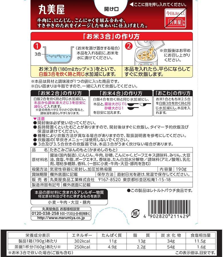 ・といだお米に入れて、炊飯器で炊くだけで、ご家庭で手軽に「釜めし」が楽しめます。・牛肉に食感のよいこんにゃく、彩りのよいにんじんを組み合わせた釜めしの素です。・牛肉を使った「すきやき」のたれをイメージした甘辛醤油味に仕上げました。牛肉の旨味たっぷりでお子様も好む味わいです。・家族で楽しめるお米3合用(3~4人前)です(「2合」「4合」「おこわ」を作れるレシピ付き)。