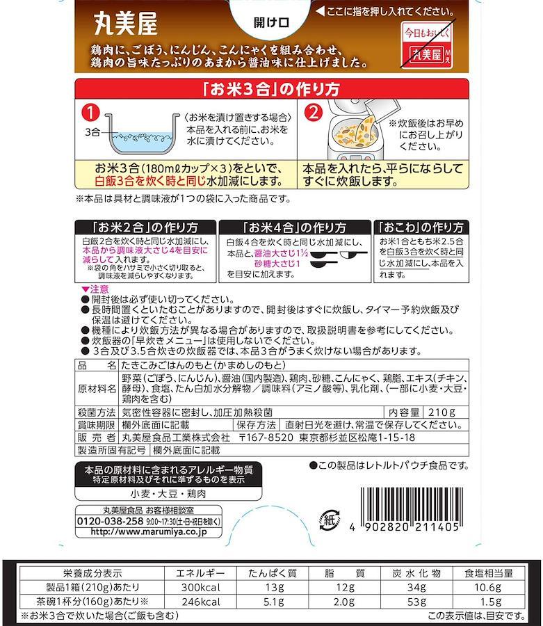 ・といだお米に入れて、炊飯器で炊くだけで、ご家庭で手軽に「釜めし」が楽しめます。・鶏肉にごぼう、彩りのよいにんじんを組み合わせた釜めしの素です。・九州エリアの「かしわめし」や「鶏めし」を参考にし、お子様も食べやすい、鶏肉の旨味をたっぷり効かせた甘辛醤油味に仕上げました。・家族で楽しめるお米3合用(3~4人前)です(「2合」「4合」「おこわ」を作れるレシピ付き)。