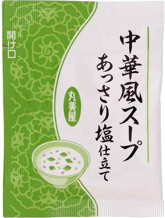 中華風スープ あっさり塩仕立て 2.5g 原材料:食塩、乳糖、砂糖、鰯粉、エキス(ちりめん、魚介、酵母)、鰹節粉、澱粉、胡麻油、鯵粉、大豆加工品、海藻カルシウム、醤油、うきみ・具(胡麻、わかめ、鶏卵)、調味料(アミノ酸等)、着色料(カラメル、カロチノイド)、グリセリン、酸化防止剤(ビタミンE)、(原材料の一部に小麦、鶏肉を含む)