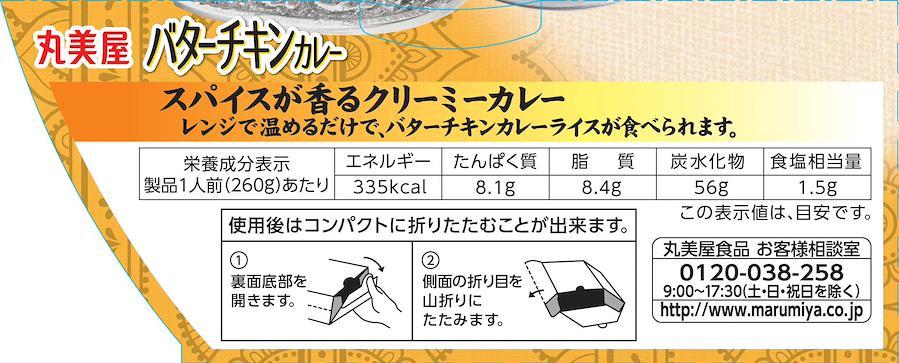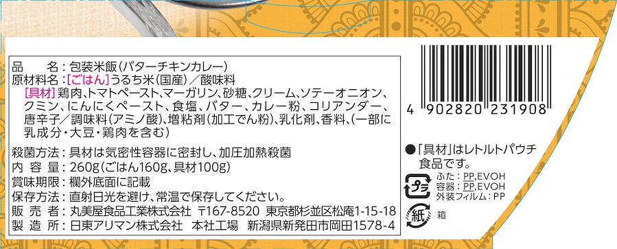 原材料:[ごはん]うるち米(国産)/酸味料|[具材]鶏肉、トマトペースト、マーガリン、砂糖、クリーム、ソテーオニオン、クミン、にんにくペースト、食塩、バター、カレー粉、コリアンダー、唐辛子/調味料(アミノ酸)、増粘剤(加工でん粉)、乳化剤、香料、(一部に乳成分・大豆・鶏肉を含む)