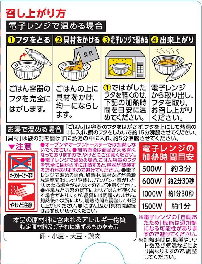 ・「ごはん」と「具材」がセットになった商品です。・材料を準備する必要がなく、電子レンジで温めるだけで簡単にお召し上がりいただけます(お湯で温めての調理も可能です)。・定番の味わいを一人前から手軽にお楽しみいただけます。・常温保存が可能なので、買い物に行けない時や、家庭・職場の常備食としても便利です。・ふんわりとした玉子と鶏肉、玉ねぎ入りで、醤油をベースに椎茸と鰹のだしの風味を効かせた優しい味わいの親子丼です。