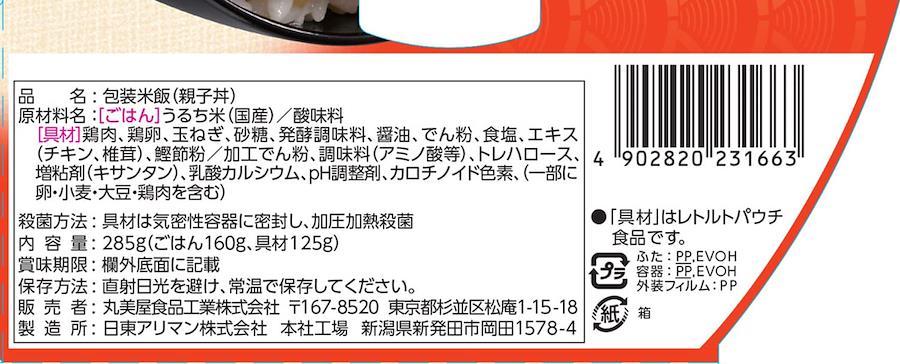 [ごはん]うるち米(国産)/酸味料[具材]鶏肉、鶏卵、玉ねぎ、砂糖、発酵調味料、醤油、でん粉、食塩、エキス(チキン、椎茸)、鰹節粉/加工でん粉、調味料(アミノ酸等)、トレハロース、増粘剤(キサンタン)、乳酸カルシウム、pH調整剤、カロチノイド色素、(一部に卵・小麦・大豆・鶏肉を含む)