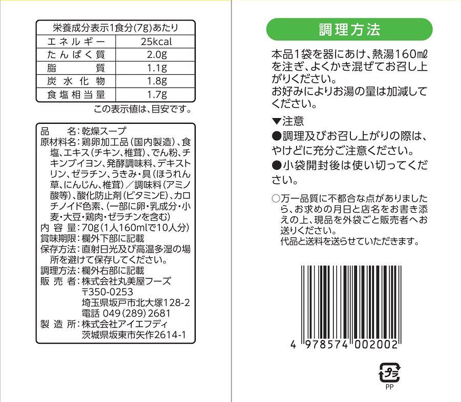 鶏卵加工品(国内製造)、食塩、エキス(チキン、椎茸)、でん粉、チキンブイヨン、発酵調味料、デキストリン、ゼラチン、うきみ・具(ほうれん草、にんじん、椎茸)/調味料(アミノ酸等)、酸化防止剤(ビタミンE)、カロチノイド色素、(一部に卵・乳成分・小麦・大豆・鶏肉・ゼラチンを含む)