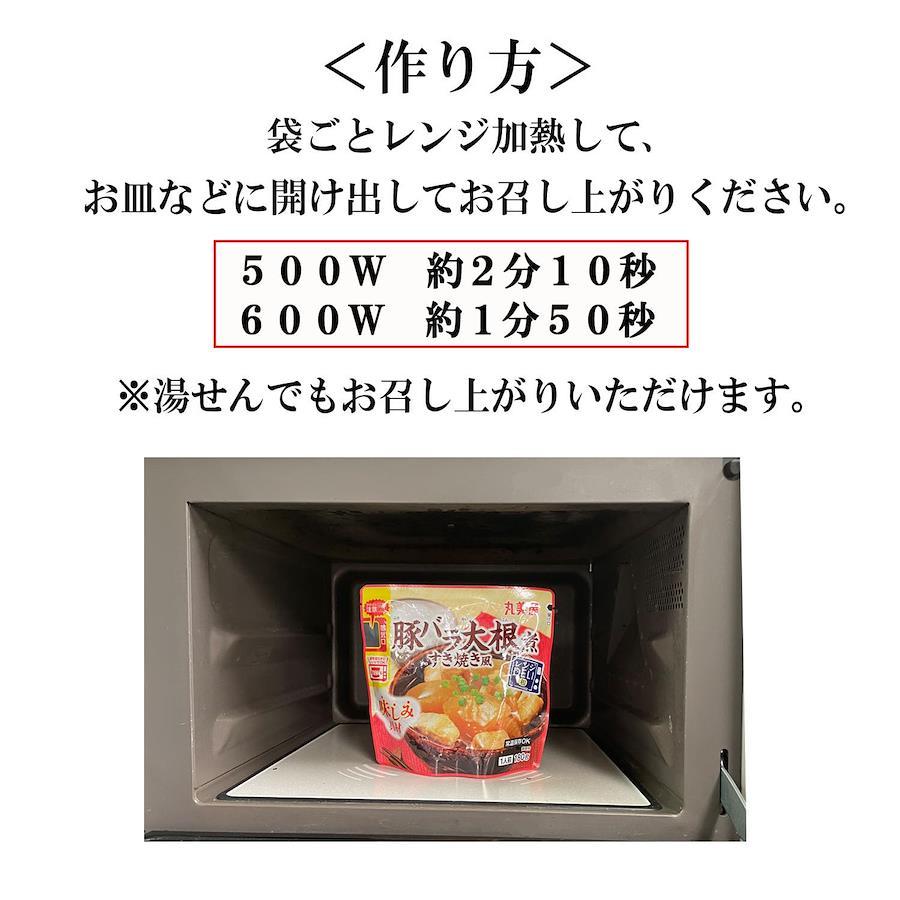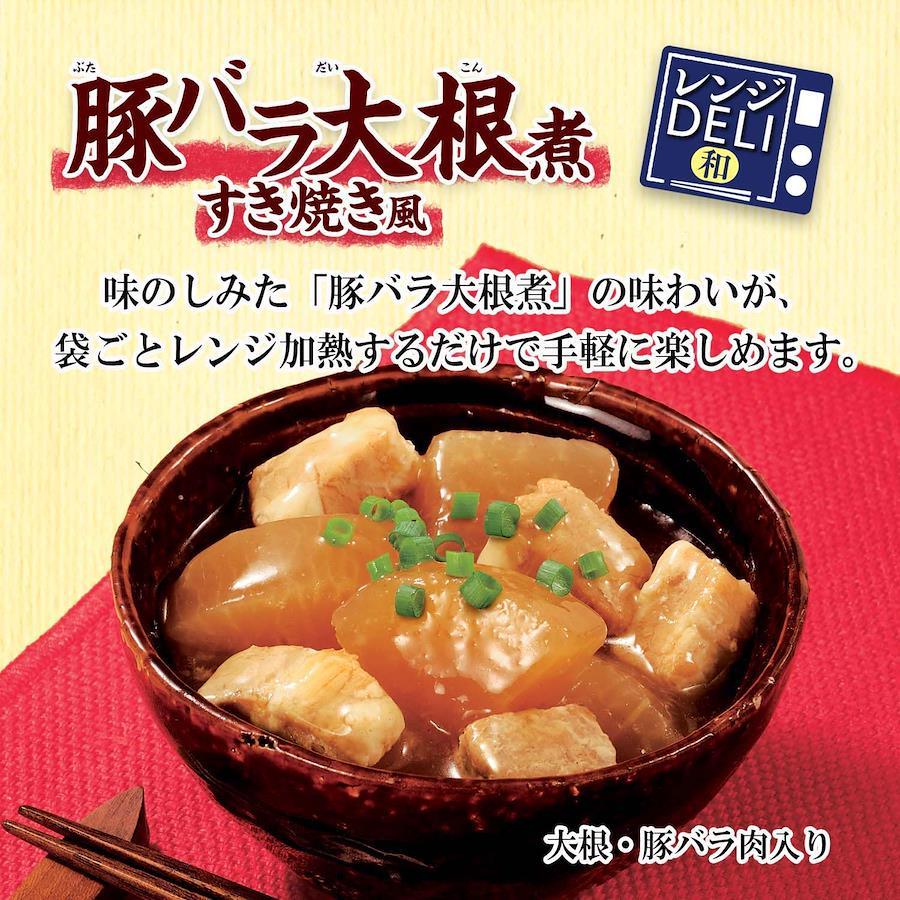 ・袋ごとレンジで加熱するだけで定番のおかずが楽しめる、「レンジ対応パウチ」商品です。・常温で長期保存可能なので、冷蔵庫の場所を取らず、買い置きにも便利です。・すき焼き風の甘辛醤油味に仕上げた豚バラ大根煮です。・具材は大根、豚バラ肉入り。